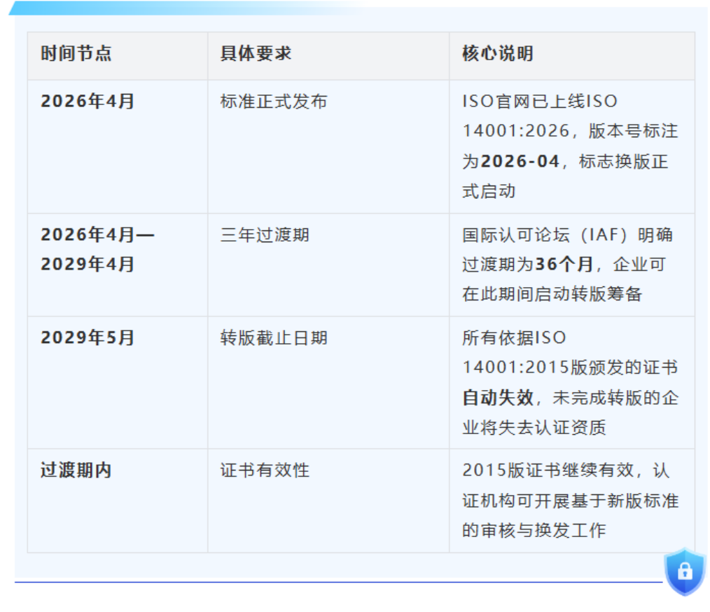 ISO 14001:2026《环境管理体系 要求及使用指南》国际标准已于2026年4月正式发布,正式取代现行的ISO 14001:2015版。这是继2015版后,环境管理体系标准的又一次重大修订,全球超50万张2015版证书即将迎来换版窗口期。