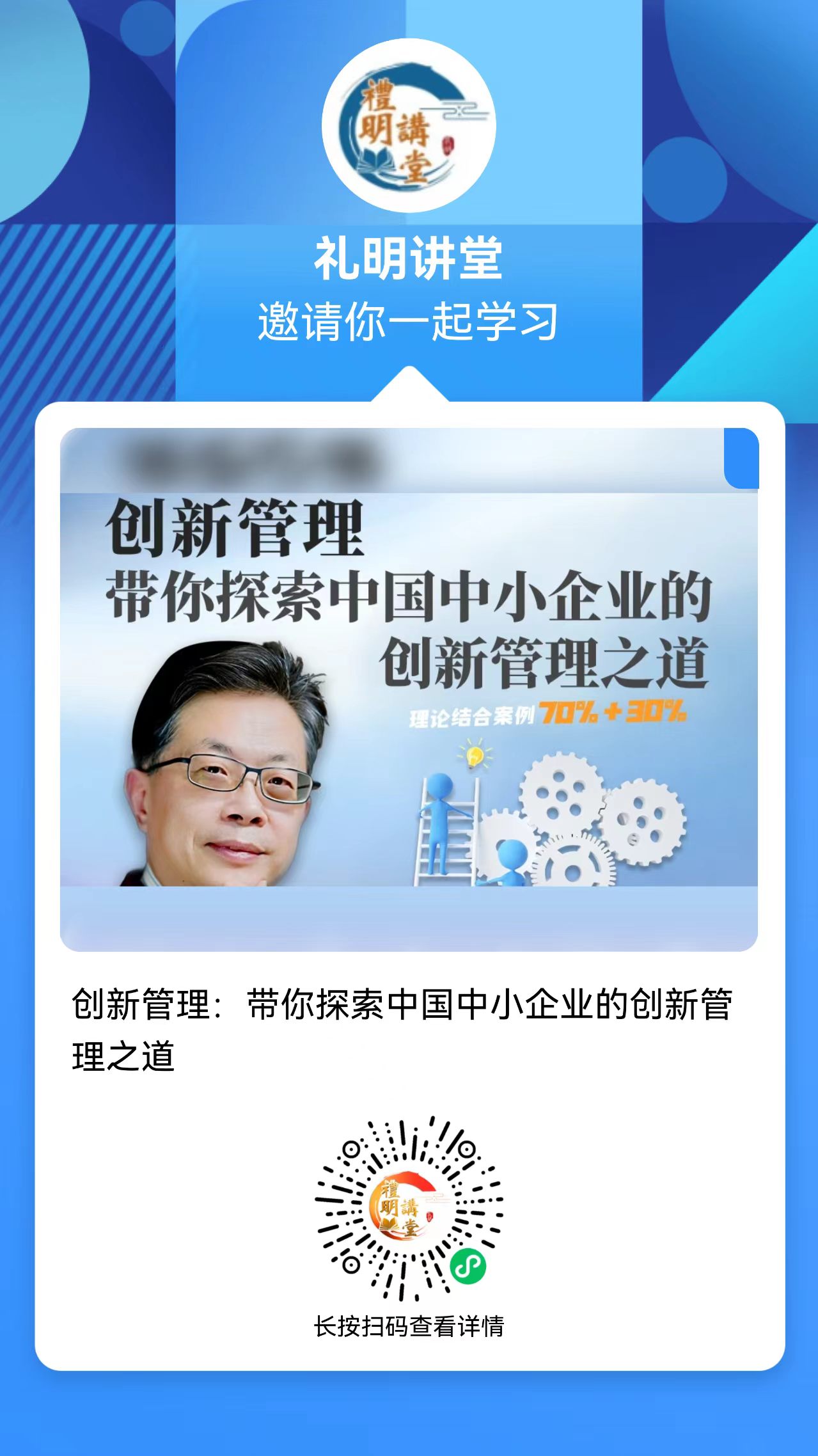 所以,礼明讲堂特意推出在线录播课——《创新管理:带你探索中国中小企业的创新管理之道》,把创新管理逻辑拆解成中小企业能直接用的步骤、工具和框架,只讲能落地、有效果的实战方法。